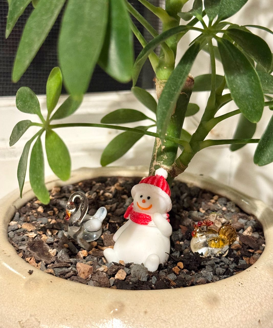 Latte now sits under a bonsai tree on my windowsill, next to a tiny swan and a tiny chicken. He seems content to join the menagerie. They, too, seem happy with the new addition. More importantly, he brings me a surprising amount of grounded joy whenever I look at him.